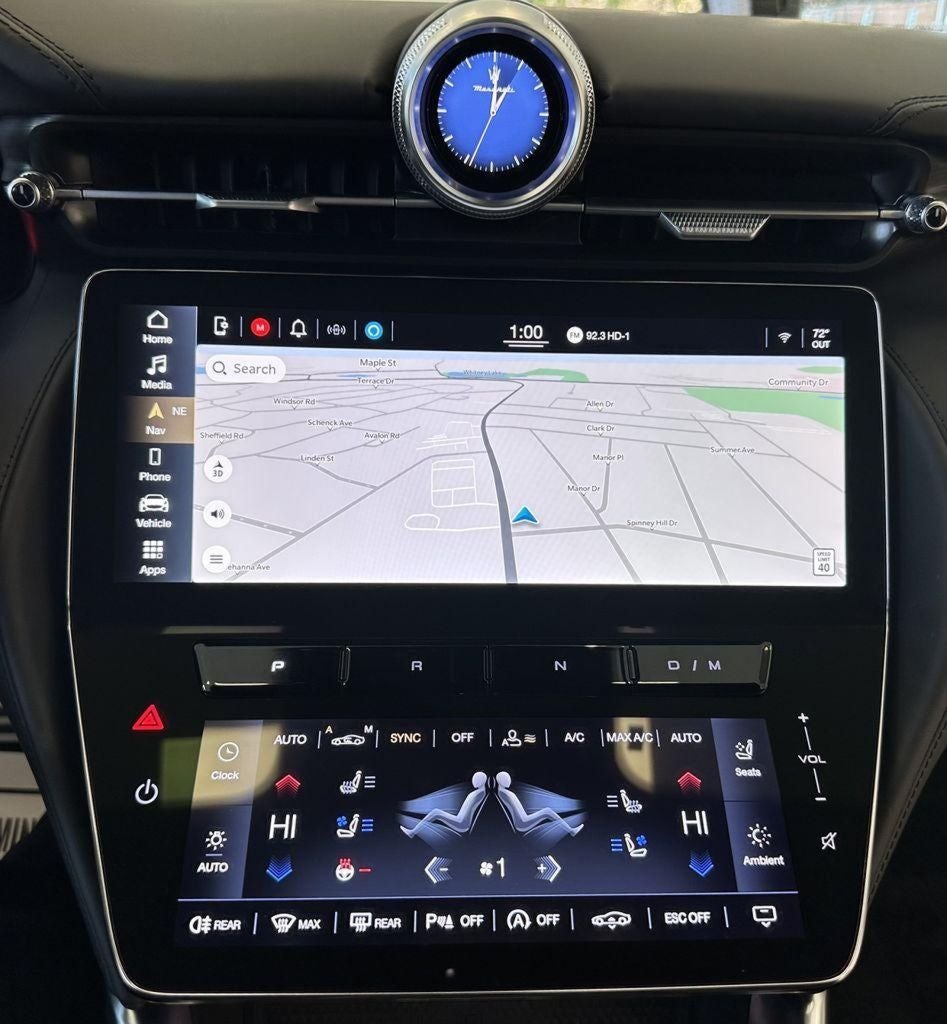 - Radio: Maserati Intelligent Assistant w/Navigation -inc: 12.3" upper touchscreen, 8.8" lower touchscreen, HD Radio, SiriusXM radio (1-year trial subscription), wired and wireless Apple CarPlay, wired and wireless Android Auto, Maserati Connected Services w/trial subscriptions, Alexa in-vehicle voice assistant, eCall and bCall w/trial subscriptions and 14 speaker Sonus Faber premium audio system including subwoofer